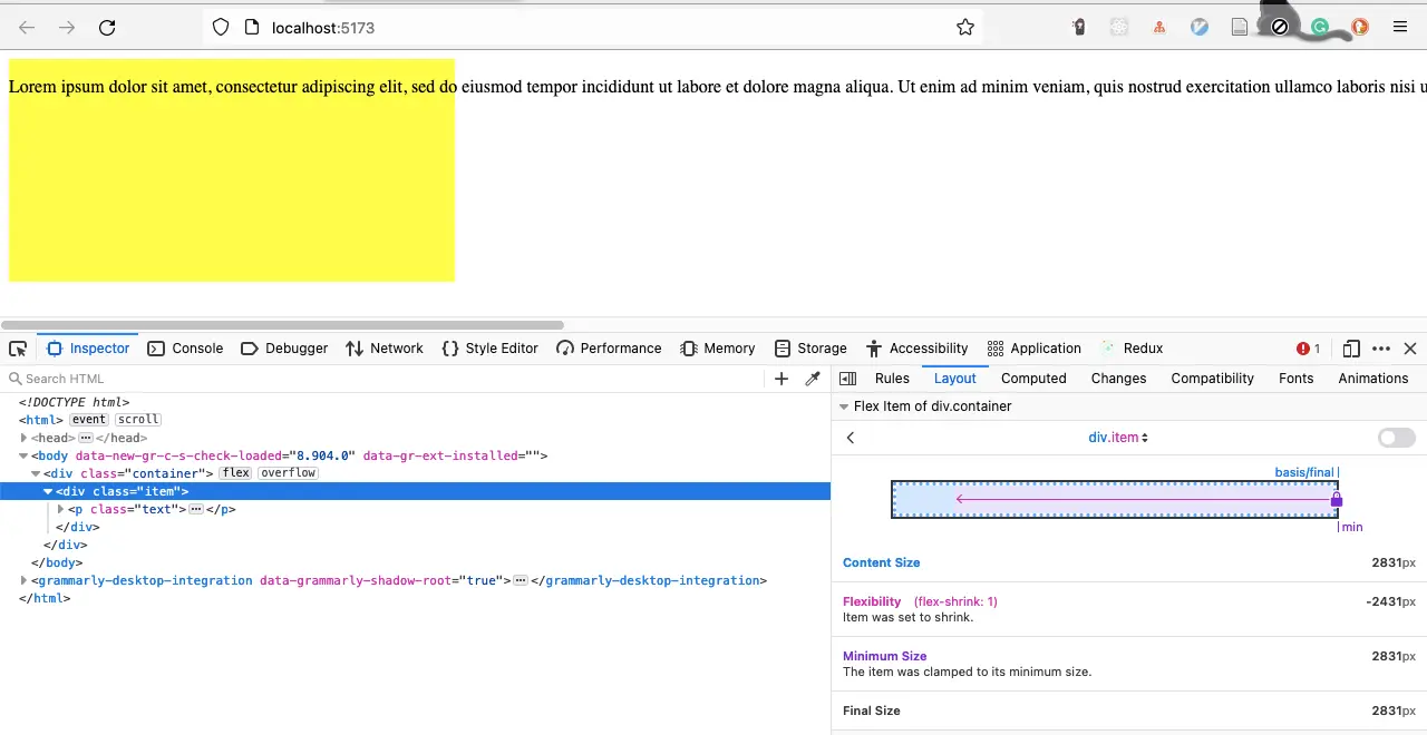 会溢出是因为在这个例子中,flex item 的 最小尺寸(minimum size) 是文本的长度,flex item 只能缩小到文本长度,而文本越长,flex item 就越长,也就溢出了。