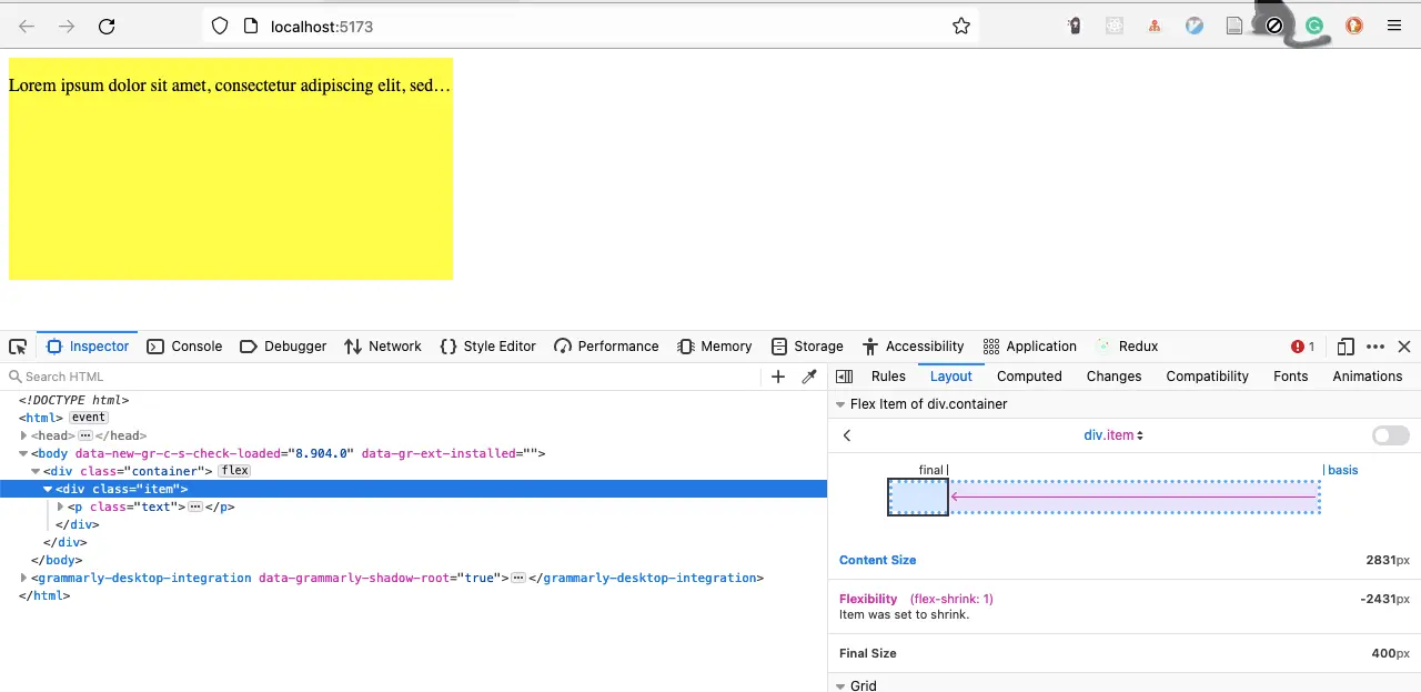 有一个 flex box,宽度是 400px,里面有一个 item,item 中有一段很长的文字,文字不换行。