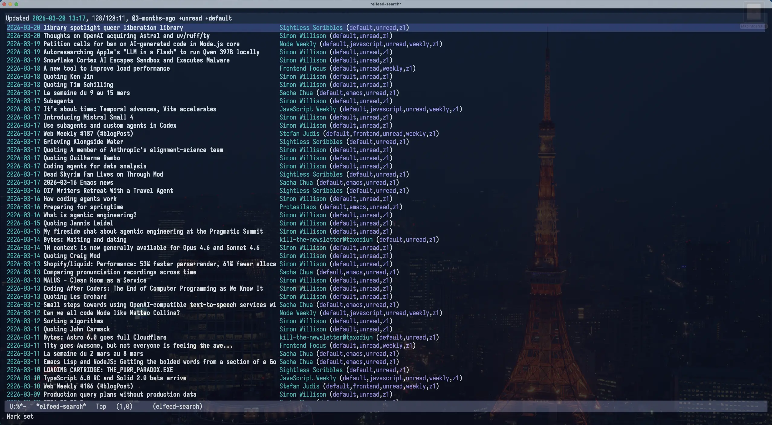 配置好之后,在 Emacs 里只需要执行 M-x elfeed ,就可以看到所有的订阅流了。另外,可以看看 elfeed 的过滤条件,方便过滤想看的订阅流。